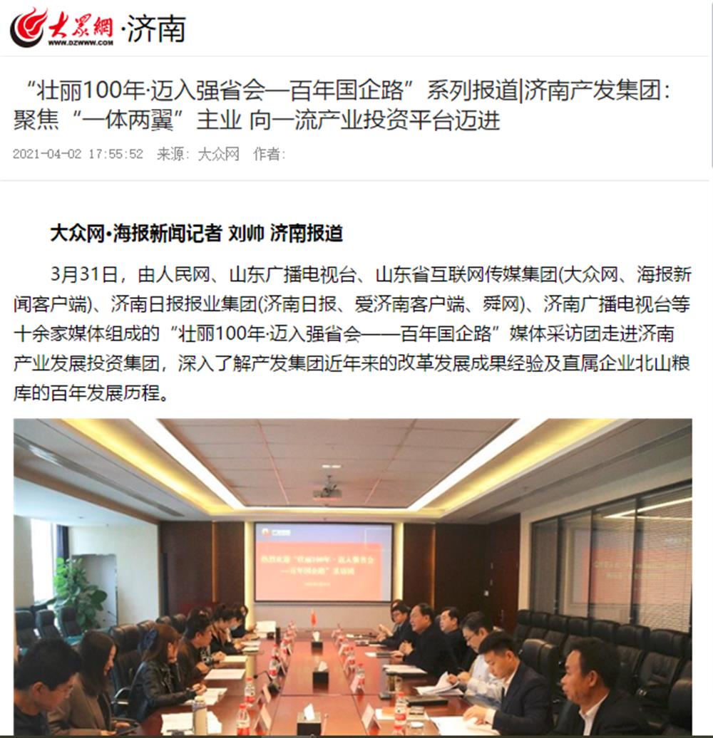 近日,市國資委舉辦的“壯麗100年·邁入強省會——百年國企路”媒體團一行到訪濟南產(chǎn)發(fā)集團后,人民網(wǎng)、大眾網(wǎng)、閃電新聞、濟南電視臺、濟南日報、帶濟南等多家國家、省市級媒體聚焦報道了集團改革發(fā)展的成果經(jīng)驗。